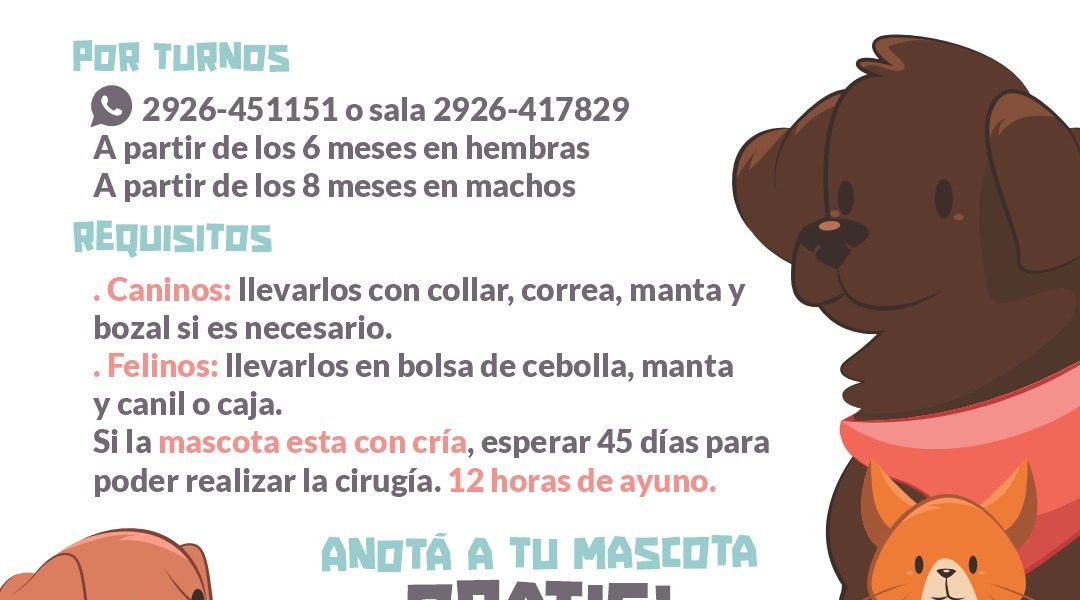 Pedí turno por WhatsApp al 2926-451151 o a la sala 2926-417829. A partir de los 6 meses en hembras y de los 8 meses en machos. Al momento de concurrir al turno la mascota debe tener 12 horas de ayuno. Si es un canino tenés que llevarlo con collar, correa, manta y bozal si es necesario, mientras que a los