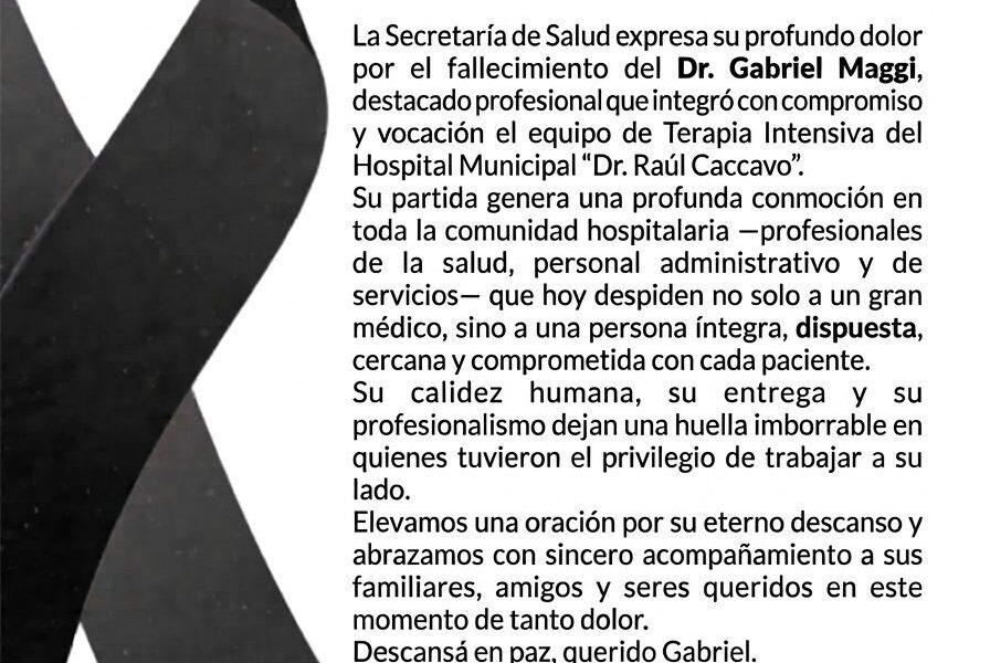 La Secretaría de Salud expresa su profundo dolor por el fallecimiento del Dr. Gabriel Maggi, destacado profesional que integró con compromiso y vocación el equipo de Terapia Intensiva del Hospital Municipal “Dr. Raúl Caccavo”. Su partida genera una profunda conmoción en toda la comunidad hospitalaria —profesionales de la salud, personal administrativo y de servicios— que hoy despiden no solo a