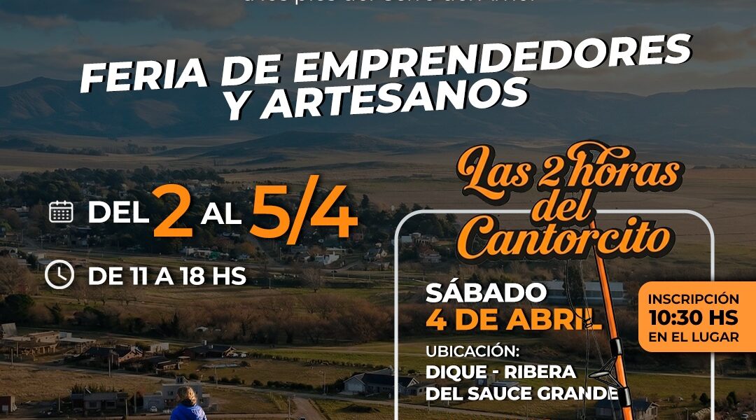 Te invitamos a disfrutar de Villa La Arcadia, un lugar único a los pies del Cerro del Amor, en el predio frente al dique. Del 2 al 5 de abril De 11 a 18 hs Feria de Emprendedores y Artesanos “Las 2 horas del Cantorcito” para compartir en familia (recordá llevar caña, carnada y estar acompañado por un adulto)