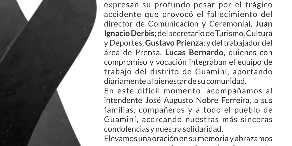 El Intendente Municipal de Coronel Suárez, Ricardo Moccero, junto a todo su gabinete, expresan su profundo pesar por el trágico accidente que provocó el fallecimiento del director de Comunicación y Ceremonial, Juan Ignacio Derbis; del secretario de Turismo, Cultura y Deportes, Gustavo Prienza; y del trabajador del área de Prensa, Lucas Bernardo, quienes con compromiso y vocación integraban el equipo