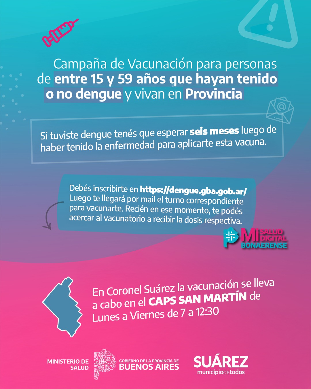 Debés inscribirte en Mi Salud Digital Bonaerense https://dengue.gba.gob.ar/ Luego te llegará por mail el turno correspondiente para vacunarte. Recién en ese momento, te podés acercar al vacunatorio a recibir la dosis respectiva.