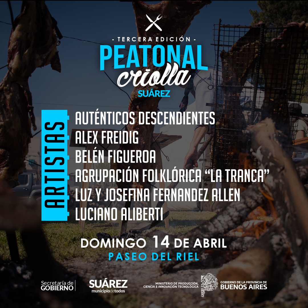 La 3° edición de la PEATONAL CRIOLLA viene a “levantar bien en alto” nuestro sentir de PATRIA con la presentación de artistas locales como: Alex Freidig, Auténticos Descendientes, Belén Figueroa, Agrupación Folclórica “La Tranca”, Luz y Josefina Fernández Allen y Luciano Aliberti.