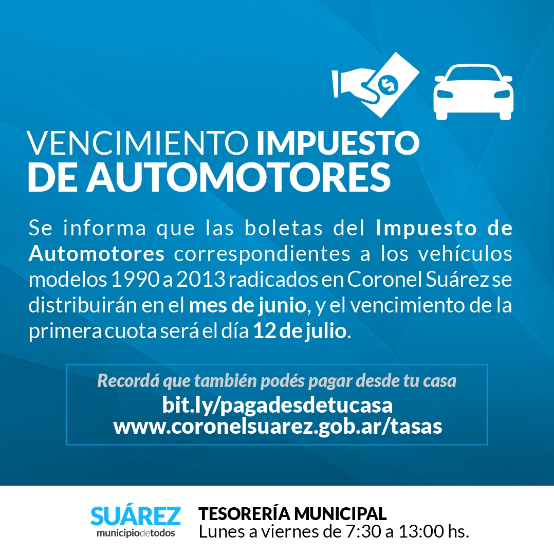 La Dirección de Recaudación de Coronel Suárez informa que la cuota 1º y el pago anual del Impuesto a los Automotores correspondiente a los vehículos modelos 1990 a 2013 radicados en Coronel Suárez, vencerá el día 12 de julio y las boletas se distribuirán durante el mes de junio.