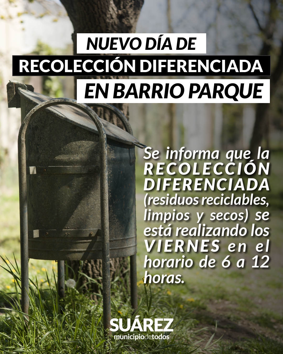 Se informa a los vecinos de Barrio Parque que la RECOLECCIÓN DIFERENCIADA (residuos reciclables) se estará realizando los días viernes en el horario de 6:00 a 12:00.-