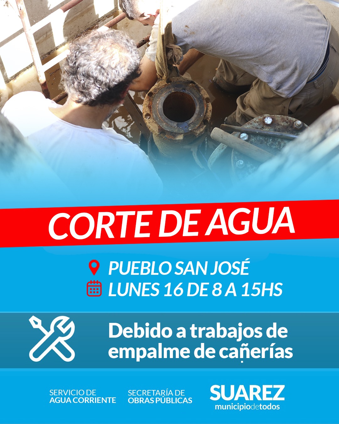 La Delegación Municipal de Pueblo San José informa que el lunes 16 de junio, entre las 8:00 y las 15:00 horas, se realizará un corte en el suministro de agua corriente debido a trabajos de empalme de cañerías.