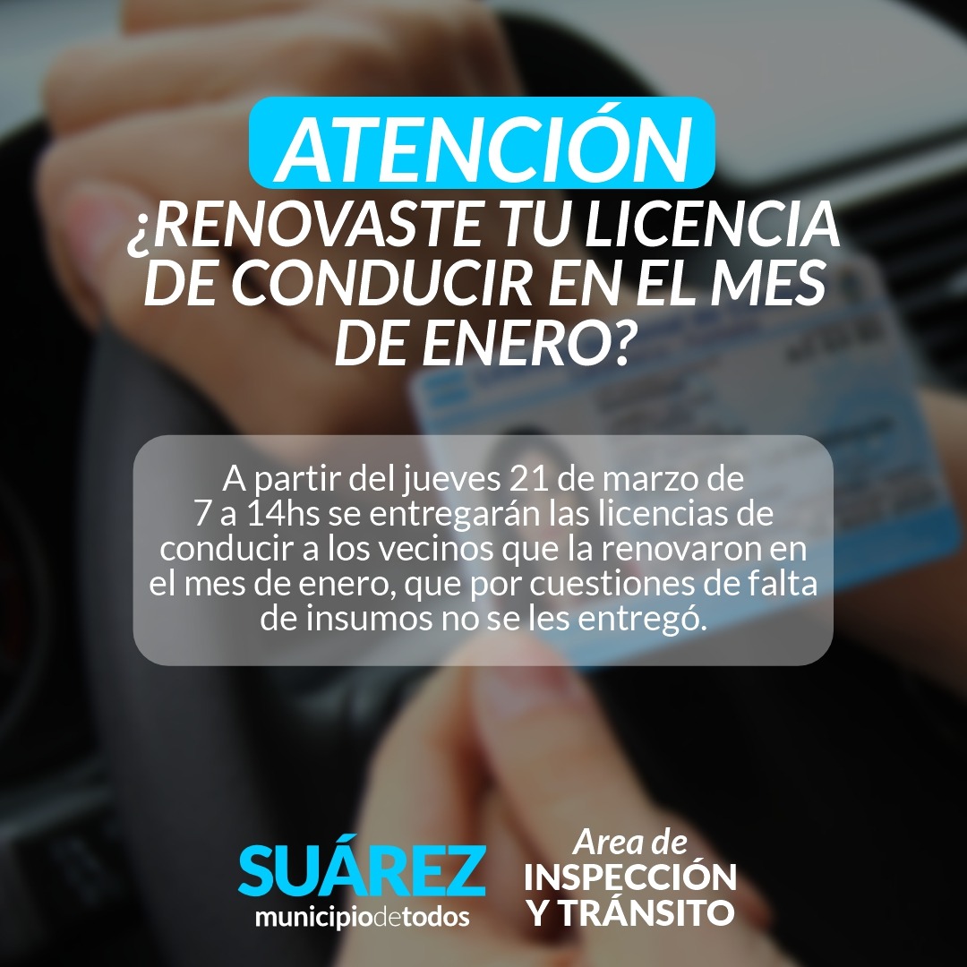 El área de Inspección y Tránsito, informa a la población que a partir de mañana (jueves 21 de marzo), todos los días a partir de 7 a 14 hs, se entregarán las licencias de conducir a los vecinos que las renovaron en el mes de enero y por cuestiones de falta de insumos, no se les entregó, en tiempo y forma, el carnet.