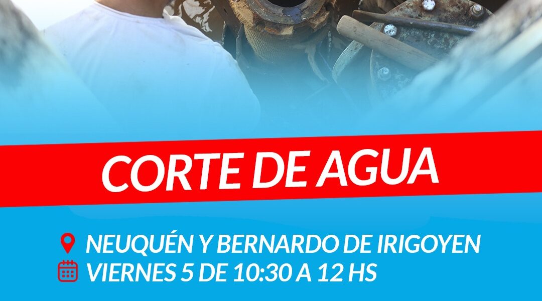 El servicio de Agua Corriente dependiente de la Secretaría de Obras Públicas informa que este viernes –5 de diciembre–se realizará un corte de agua programado por trabajos de empalme en calle Neuquén esquina B. de Irigoyen. Horario: de 10:30 a 12:00 hs. Se solicita a la comunidad hacer un uso responsable del agua para evitar desabastecimiento