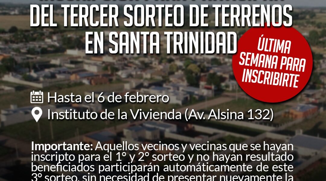 3° Sorteo de Terrenos en Santa Trinidad Si todavía no te anotaste, ¡este es el momento! Inscripciones abiertas hasta el 6 de febrero Instituto de la Vivienda – Av. Alsina 132 Quienes se inscribieron en el 1° y 2° sorteo y no fueron beneficiados participan automáticamente. Más info: 2926 544578 | 429228 / 429306 / 429253 #ÚltimaSemana #SorteoDeTerrenos #SantaTrinidad #SuárezMunicipioDeTodos