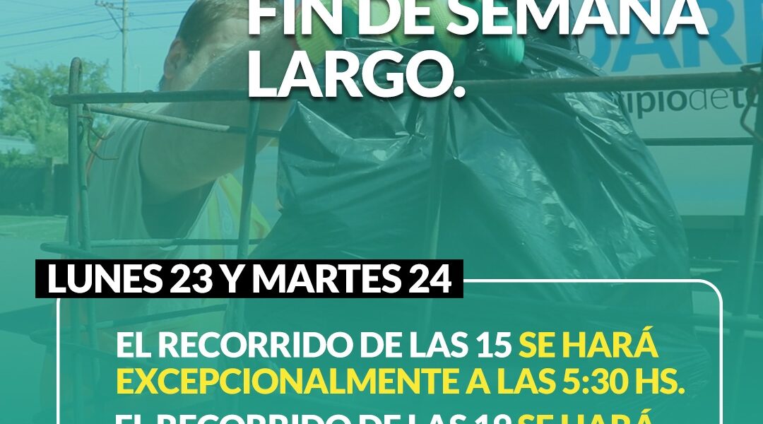 La secretaria de Servicios Públicos informa a la comunidad que los días lunes 23 de marzo día no laborable con fines turísticos y martes 24 de marzo feriado nacional por el Día Nacional de la Memoria por la Verdad y la Justicia; el servicio de recolección de residuos domiciliarios se prestará de la siguiente manera: 📍El recorrido de las 15:00hs