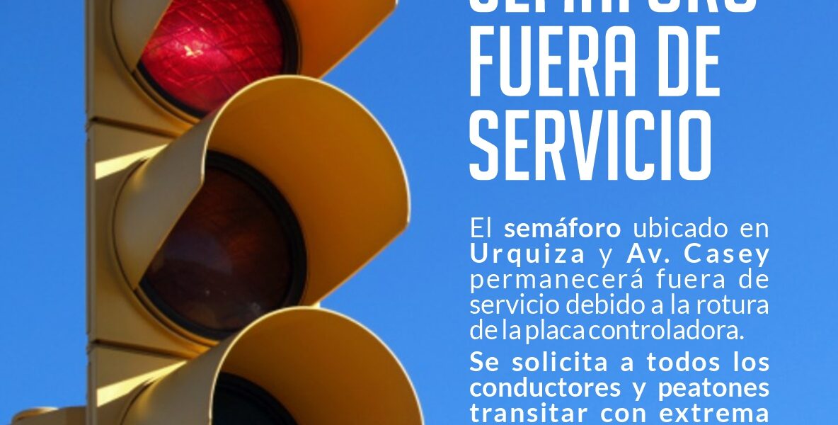 La Secretaría de Obras Públicas informa que el semáforo ubicado en Urquiza y avenida Casey permanecerá fuera de servicio debido a la rotura de la placa controladora. Se solicita a todos los conductores y peatones transitar con extrema precaución por la zona y respetar las normas de tránsito para evitar cualquier inconveniente.