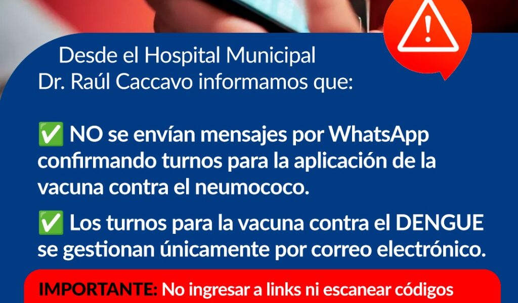 Desde el Hospital Municipal Dr. Raúl Caccavo informamos que: NO se envían mensajes por WhatsApp confirmando turnos para la aplicación de la vacuna contra el neumococo. Los turnos para la vacuna contra el DENGUE se gestionan únicamente por correo electrónico. IMPORTANTE: No ingresar a links ni escanear códigos QR que personas inescrupulosas puedan compartir. Se trata de intentos de