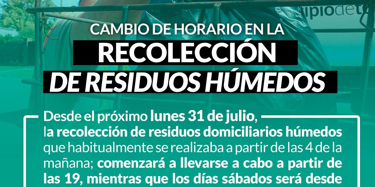 Desde el próximo lunes 31 de julio, el recorrido de la recolección de residuos domiciliarios húmedos, que habitualmente se realizaba a partir de las 4 de la mañana; comenzará a llevarse a cabo a partir de las 19:00 horas, mientras que los días sábados será desde las 9 de la mañana.