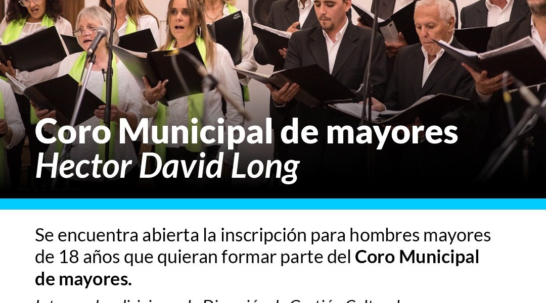 La Dirección de Gestión Cultural informa que se encuentra abierta la inscripción para hombres mayores de 18 años que quieran formar parte del Coro Municipal de Mayores “Héctor David Long”. Los interesados deben dirigirse a las oficinas de cultura en el Mercado de las Artes o comunicarse telefónicamente al 2926-429273.-