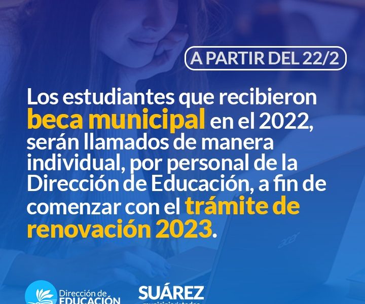 La dirección de Educación del Municipio informa que a partir del 22 de febrero, los estudiantes que recibieron becas municipales en el 2022, serán llamados de manera individual, por personal de la Dirección con el fin de comenzar con el trámite de renovación de becas para el 2023.