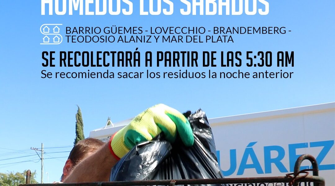 La Secretaría de Servicios Públicos informa a la comunidad que la recolección domiciliaria de residuos los días sábados se realizará en el horario de 5:30 a 11:30 horas, abarcando los siguientes barrios y cuadrículas: Barrio Güemes, Avenida 12 de Octubre, Mandisoví, Avenida Independencia y Buenos Aires. Barrio Lovecchio (1 y 2), Gregoria Matorras, República del Perú y Grand Bourg.