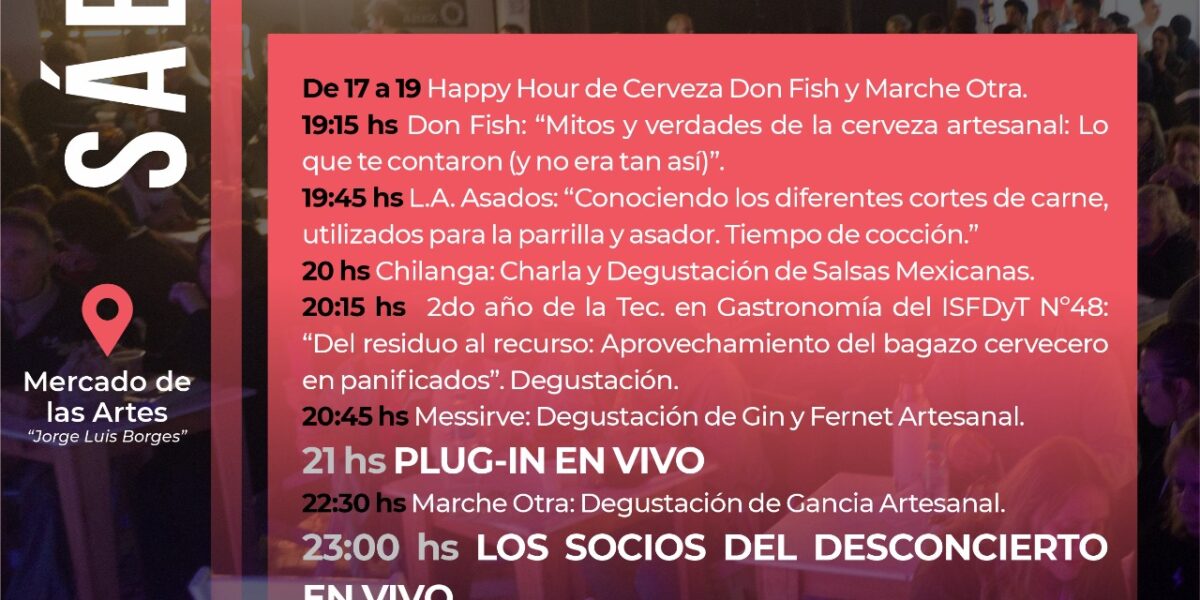 Mercado de las Artes – Coronel Suárez Sábado 1 y domingo 2 de noviembre – desde las 17 hs Entrada libre y gratuita ¡Vuelve el sabor, la creatividad y el talento suarense! Dos jornadas imperdibles con masterclass en vivo, degustaciones, expositores locales; exquisita y variada carta gastronómica y la presentación de bandas en vivo que harán del fin de semana