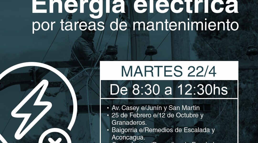 Edes SA Coronel Suárez comunica a sus usuarios que por tareas de mantenimiento en media tensión interrumpirá el suministro de energía eléctrica el martes 22 de abril desde las 08:30hs hasta las 12:30hs. Los sectores afectados son: Av.Casey e/Junín y San Martin. 25 de Febrero e/12 de Octubre y Granaderos. Baigorria e/Remedios de Escalada y Aconcagua. Granaderos e/Remedios de Escalada