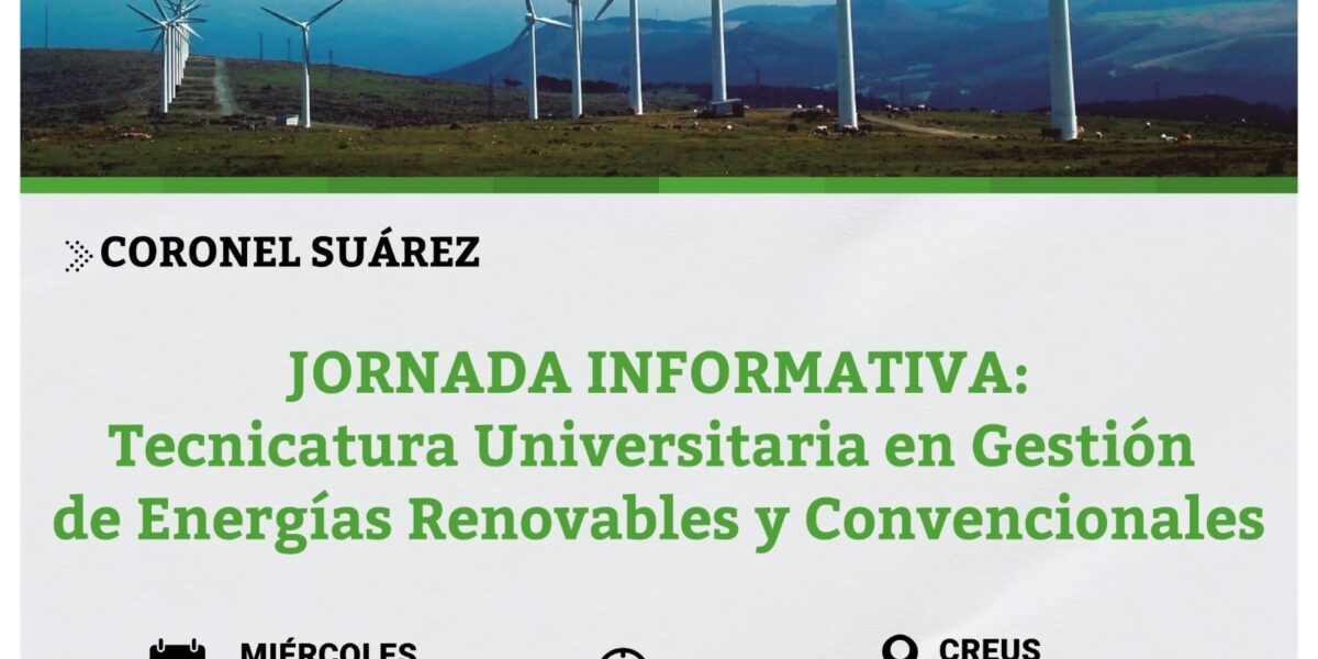 El Centro Regional Educativo Universitario Suarense (CREUS) y la Universidad Provincial del Sudoeste (UPSO) invitan a toda la comunidad a participar de una jornada informativa sobre la Tecnicatura Universitaria en Gestión de Energías Renovables y Convencionales, una propuesta educativa orientada al futuro y al cuidado del medioambiente, planificada en el plan de estudio del ciclo lectivo 2025 Fecha: Miércoles