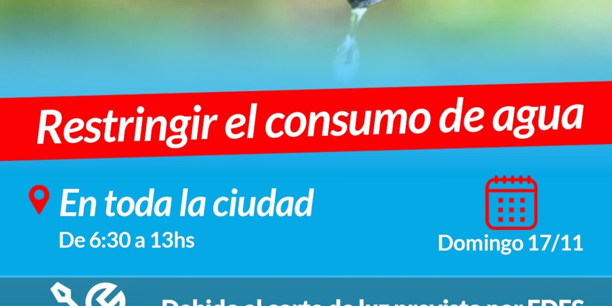 La Secretaría de Obras Públicas solicita a toda la población extremar el consumo de agua en toda la ciudad, este domingo 17 de noviembre, de 6.30 a 13:00 horas, debido a un corte de energía programado por EDES, que afectará el funcionamiento de las bombas de agua. Horario del corte de energía: 6.30 a 12 horas 💧 Horario recomendado