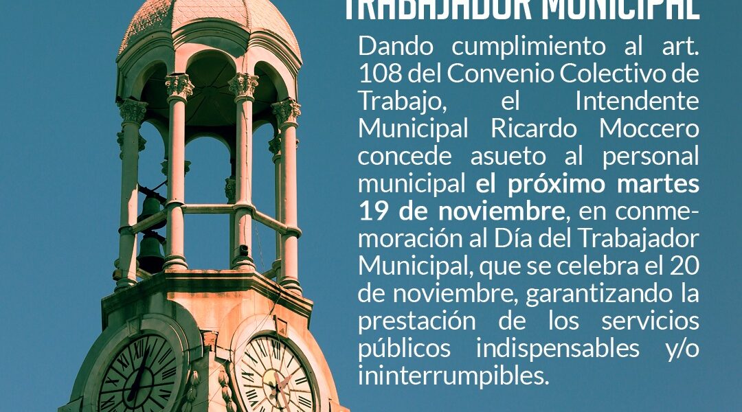 Dando cumplimiento al artículo 108 del Convenio Colectivo de Trabajo, el Intendente Municipal Ricardo Moccero concede asueto al personal municipal el próximo martes 19 de noviembre, en conmemoración al Día del Trabajador Municipal, que se celebra el 20 de noviembre, garantizando la prestación de los servicios públicos indispensables y/o ininterrumpibles.