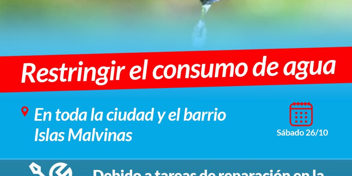 Desde la secretaría de Obras Públicas solicitamos restringir el consumo de agua de red en toda la ciudad y el barrio Islas Malvinas, *MAÑANA sábado 26*, debido a tareas de *reparación en la cañería de la “bomba 4”*. Colaboremos evitando el uso de agua para llenar piletas y el riego de jardines. Estamos trabajando para mejorar el servicio y asegurar