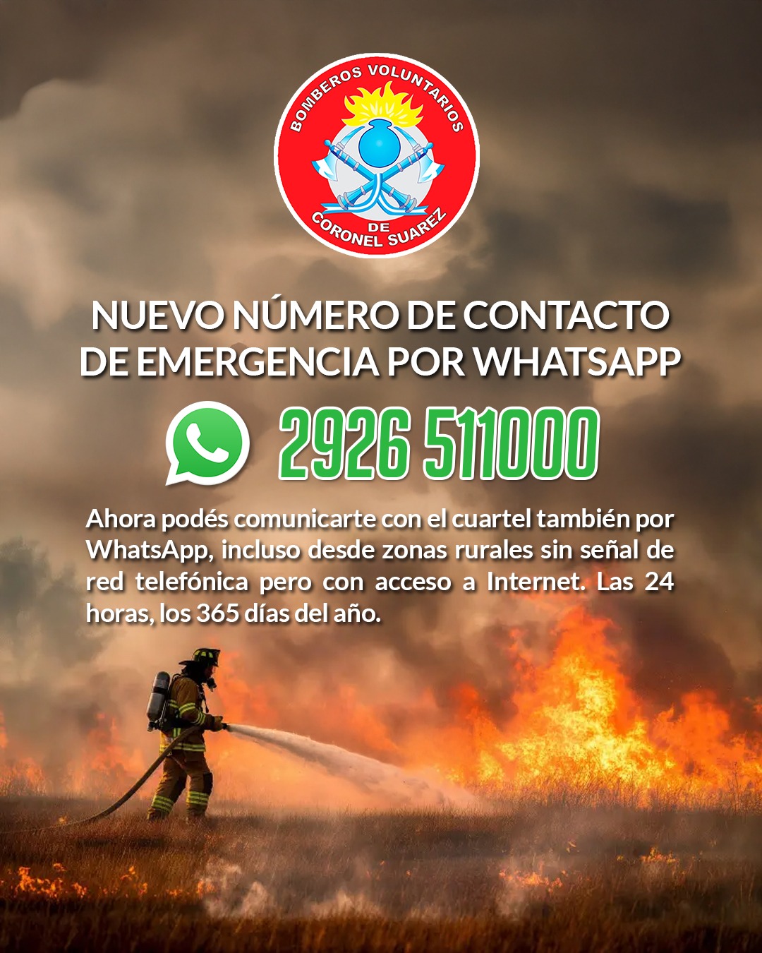 El Cuartel de Bomberos Voluntarios de Coronel Suárez informa que ya se encuentra habilitado el número 2926 511000, destinado a comunicaciones de emergencia a través de llamadas de WhatsApp, especialmente útil en zonas rurales o sectores con escasa cobertura de la red telefónica tradicional, pero con acceso a Internet.