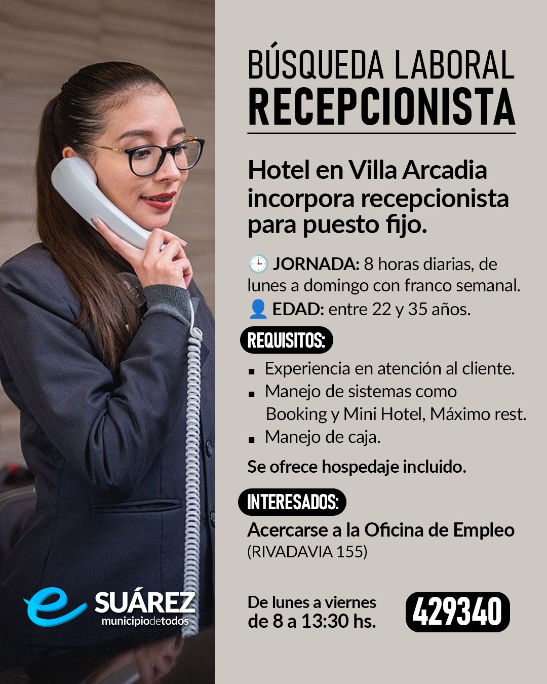 Hotel en Villa Arcadia incorpora recepcionista para puesto fijo.