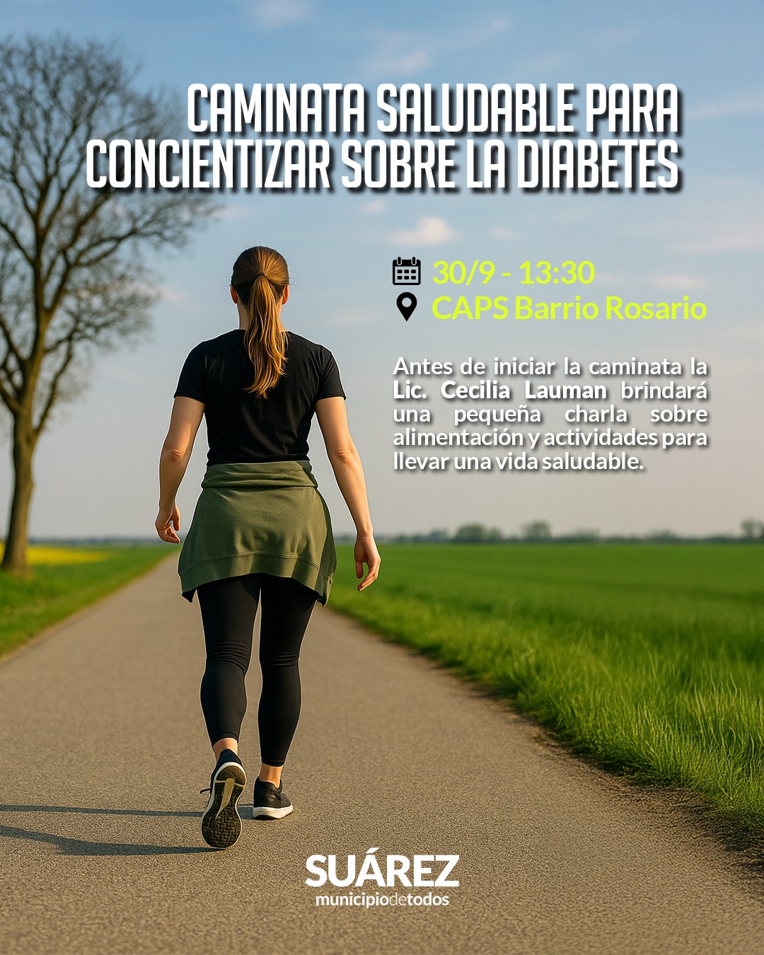 Este martes 30 de septiembre, a las 13:30, te invitamos a sumarte en el CAPS Barrio Rosario a una caminata saludable para concientizar sobre la diabetes y promover una mejor calidad de vida.