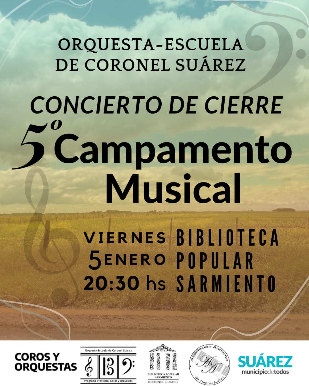 “Es casi ya una tradición cerrar el campamento en la biblioteca, donde además se sumarán alumnos que están estudiando música fuera de Suárez, y que que vuelven para la actividad; algunos de ellos son los que participaron de la juvenil provincial el año pasado como Luz Aguirre, Agustín Palacio, Camila Meyer y otros chicos que están estudiando en Bahía Blanca, La Plata y Buenos Aires”, enumeró.