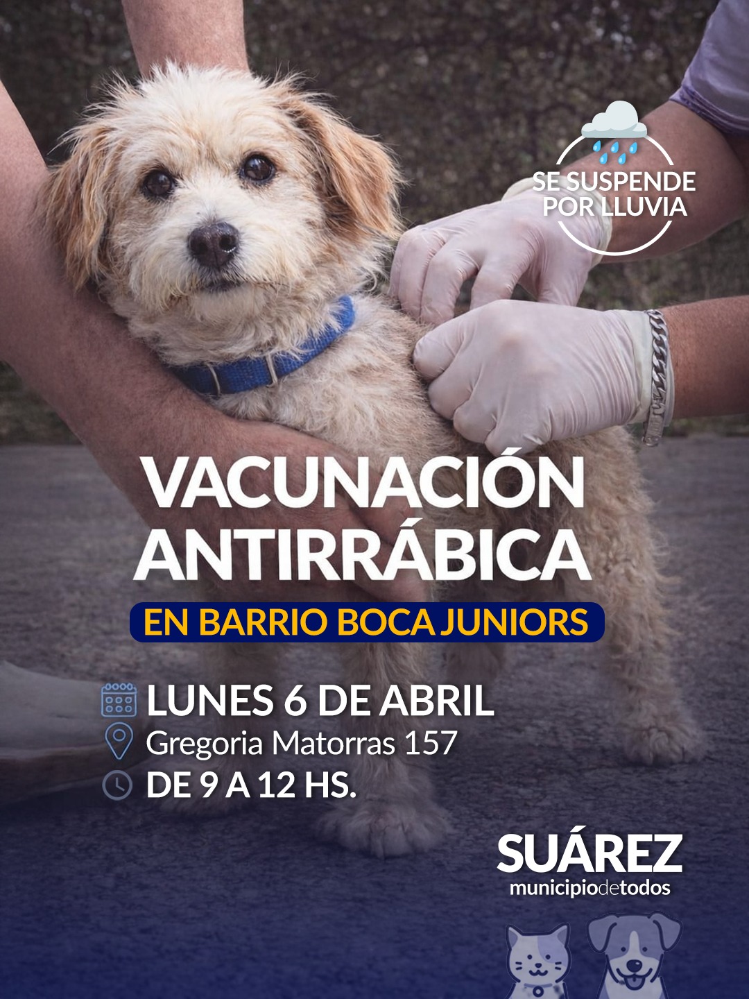 El equipo de profesionales desarrollará este LUNES 6 DE ABRIL, una nueva jornada de vacunación antirrábica gratuita para perros y gatos en el Barrio Boca Juniors -Gregoria Matorras 157-