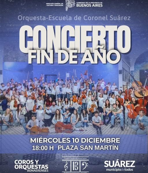 Se acerca uno de los momentos más especiales del año: el Concierto de Fin de Año de la Orquesta Escuela de Coronel Suárez Los invitamos a compartir una tarde llena de música, encuentro y celebración junto a todos los niños, niñas y jóvenes que forman parte de la Orquesta Escuela. Será una oportunidad para disfrutar del trabajo realizado durante todo