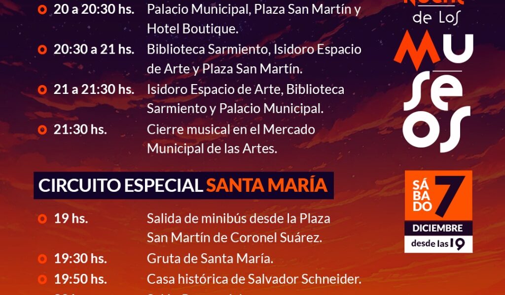 Con gran éxito el Municipio de Coronel Suárez junto a instituciones impulsaron por primera vez, el evento “La Noche de los Museos”, donde los vecinos fueron parte de una movida cultural y artística, descubriendo aspectos de la historia de las instituciones, de personajes históricos que marcaron nuestro crecimiento distrital, con un recorrido que se nutrió de anécdotas, historias de color,