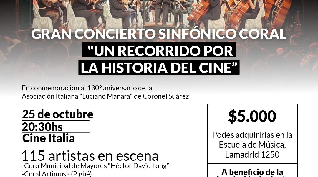 115 artistas en escena, en el marco del 130° aniversario de la Asociación Italiana de Coronel Suárez. Coro Municipal de Mayores “Héctor David Long”, Coral Artimusa (Pigüé) Arteens, Coro de Voces Blancas de Artimusa y Orquesta de Jóvenes y Adultos de Coronel Suárez. Viernes 25 de octubre, 20:30hs, en Cine Italia. Valor de la entrada: $5.000. Podés adquirirlas en