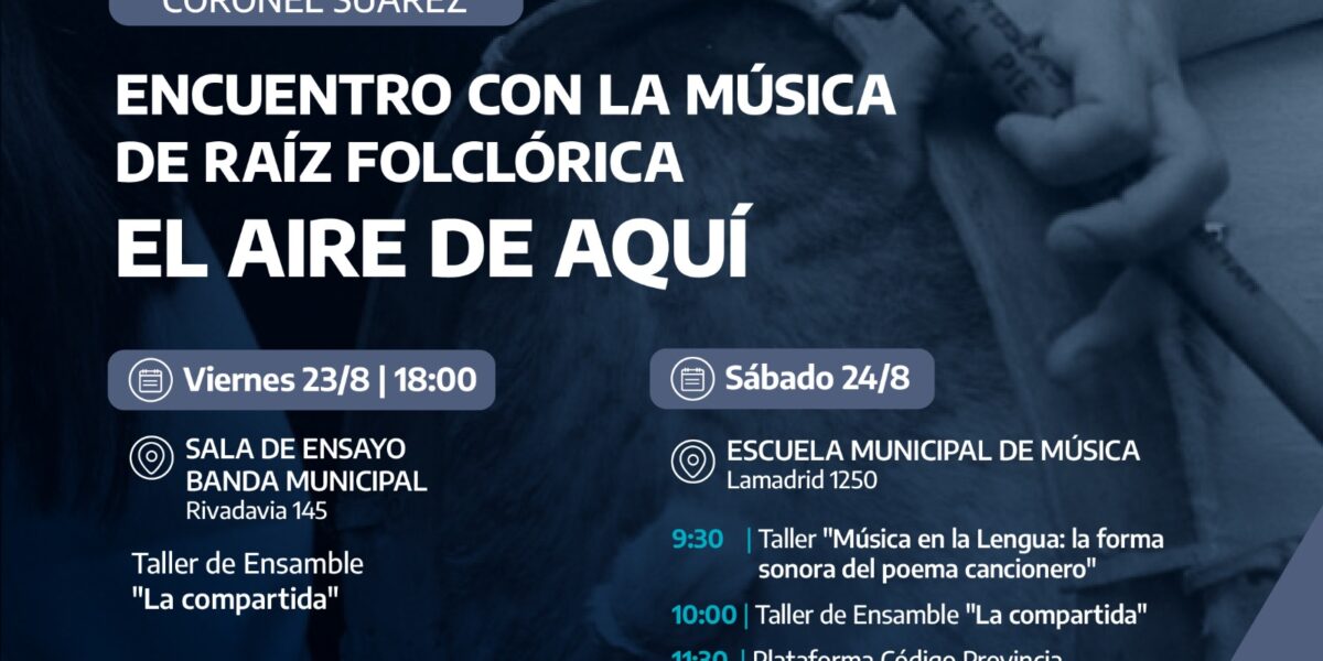 Será el 24 de agosto con el desarrollo de tres talleres y una charla conversatorio. En el marco del segundo Encuentro con la música popular bonaerense “El Aire de Aquí”, impulsado por el Instituto Cultural de la provincia de Buenos Aires se desarrollán en Coronel Suárez una serie de talleres de formación musical totalmente GRATUITOS y abiertos a la comunidad.