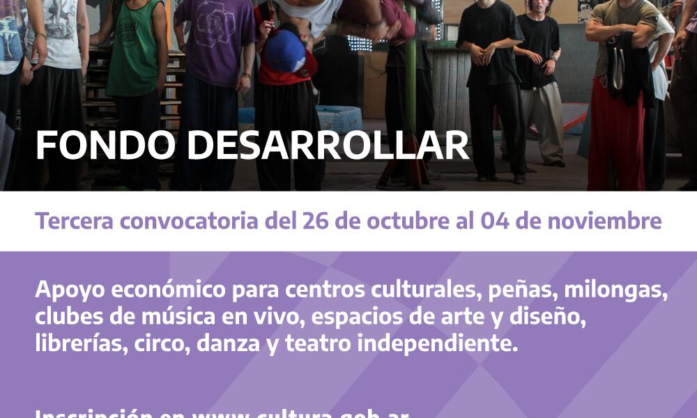 ?Los interesados en concursar el apoyo económico para su espacio cultural tienen tiempo hasta el 4 de noviembre. ?Por consultas pueden comunicarse al 429273 o a los mails: desarrollar@cultura.gob.ar o culturasuarez@yahoo.com.ar ➡El Ministerio de Cultura de la Nación invita a participar hasta el 4 de noviembre, de la tercera convocatoria del Fondo Desarrollar, una política pública que tiene como objetivo