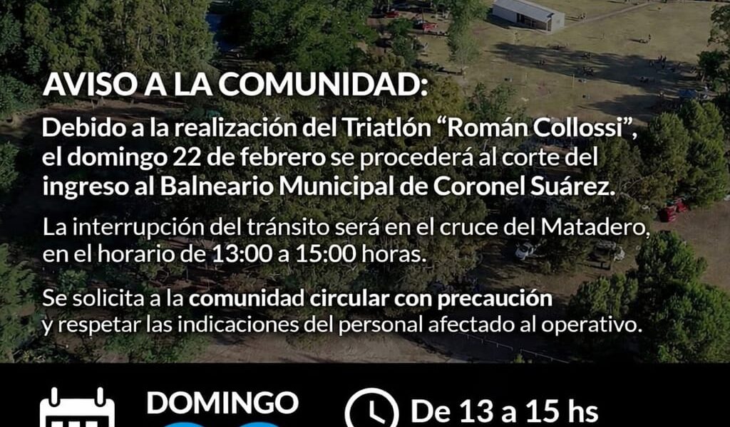 Debido a la realización del Triatlón “Román Collossi”, el domingo 22 de febrero se procederá al corte del ingreso al Balneario Municipal de Coronel Suárez. La interrupción del tránsito será en el cruce del Matadero, en el horario de 13:00 a 15:00 horas. Se solicita a la comunidad circular con precaución y respetar las indicaciones del personal afectado al operativo.