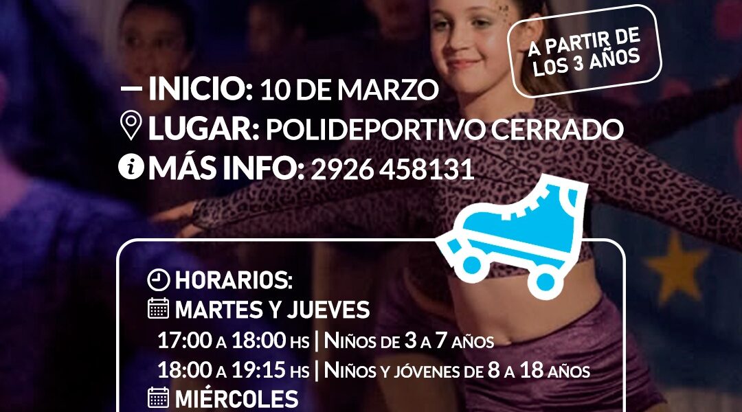 Ya están abiertas las inscripciones para la Escuela Municipal de Patín, a cargo de la profesora Luján Diel. Desde los 3 años podés iniciarte en esta hermosa disciplina y disfrutar del patinaje artístico en un espacio recreativo, formativo y lleno de energía. Lugar: Polideportivo Cerrado Más información e inscripciones: 2926 45 8131 Inicio de clases: 10 de marzo Horarios: