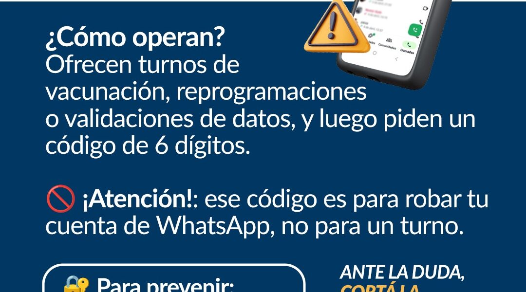 Se detectaron nuevos intentos de estafa telefónica y por WhatsApp, donde los delincuentes se hacen pasar por el Ministerio de Salud, utilizando el logotipos oficiales, para engañar y acceder a cuentas personales. ¿Cómo operan? Ofrecen turnos de vacunación, reprogramaciones o validaciones de datos, y luego piden un código de 6 dígitos. Atención: ese código es para robar tu cuenta