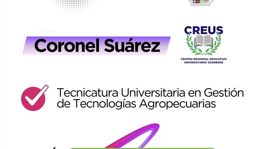 El Centro Regional Educativo Universitario Suarense (CREUS), junto a la Universidad Tecnológica Nacional (Trenque Lauquen), informa que están abiertas las inscripciones para la carrera Técnico Universitario en Gestión de Tecnologías Agropecuarias, ciclo lectivo 2025, con cursada en Coronel Suárez. Inscripciones online: Podés inscribirte completando el formulario en la web de la UTN: https://web.frtl.utn.edu.ar/45-2/carreras-2/ Inscripción – Técnico Universitario en Gestión de