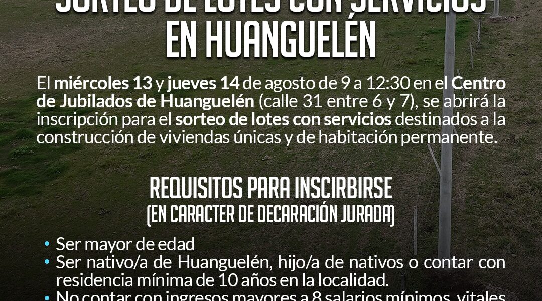 Una decisión de la Gestión del Intendente Ricardo Moccero que reafirma el compromiso con el derecho al acceso a la tierra y la posibilidad concreta de proyectar una vivienda propia. Los días miércoles 13 y jueves 14 de agosto, de 9 a 12.30 hs, en el Centro de Jubilados de Huanguelén (calle 31 entre 6 y 7), se abrirá la