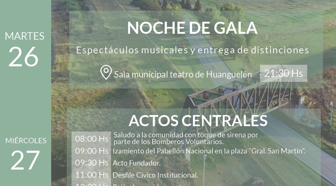El Intendente de Coronel Suárez Ricardo Moccero junto al delegado de Huanguelén Rodolfo “Fito” González; invitan a toda la comunidad a participar de los actos y actividades programadas en virtud de un nuevo aniversario de la localidad. Cronograma: Martes 26 de septiembre: NOCHE DE GALA. 21:30. Espectáculos musicales y entrega de distinciones. Lugar: Teatro Huanguelén. Miércoles 27 de septiembre: ACTOS