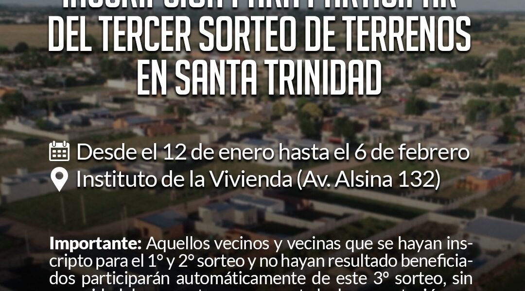 En el marco de las políticas habitacionales impulsadas por la Gestión del Intendente Ricardo Moccero, en marzo se llevará a cabo el 3º sorteo de terrenos en Pueblo Santa Trinidad, reafirmando el compromiso de trabajar de manera conjunta con las familias que necesitan acceder a un lote para construir su vivienda. Las personas interesadas en participar podrán inscribirse desde
