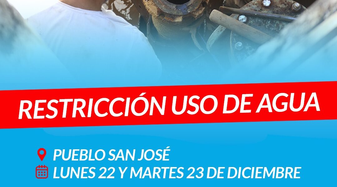 Se solicita a los vecinos y vecinas de Pueblo San José que durante los días lunes y martes realicen un uso responsable del agua, evitando cargar piletas y regar, debido a que se están llevando adelante trabajos de reparación por una rotura de cañería en calle San Pablo. Estas tareas pueden provocar disminución en la presión y posibles faltantes