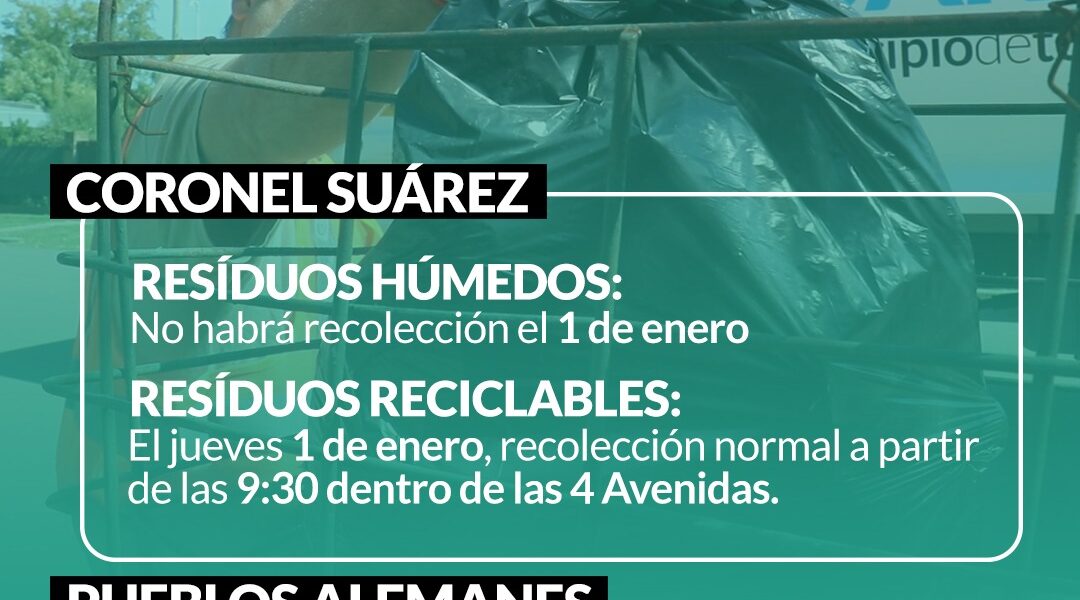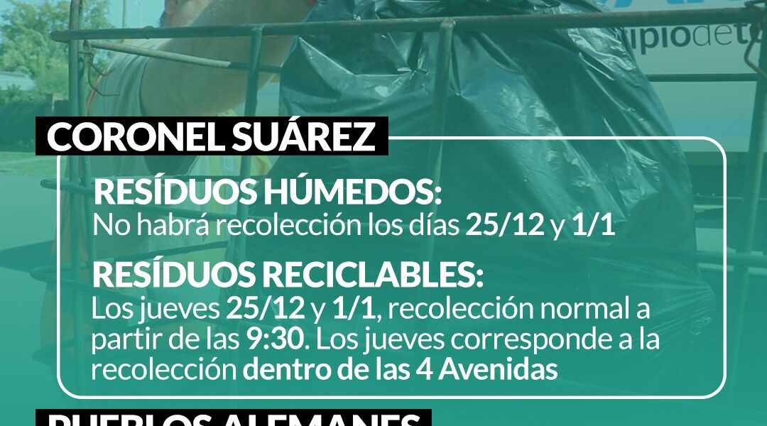 Ante la llegada de los días festivos, el Municipio de Coronel Suárez informa que el servicio de recolección de residuos domiciliarios se realizará los días miércoles 24, viernes 26, miércoles 31 y viernes 2 de enero, a partir de las 5 am. En tanto los días 25 de diciembre y 1 de enero NO HABRÁ RECOLECCIÓN. Cabe destacar que