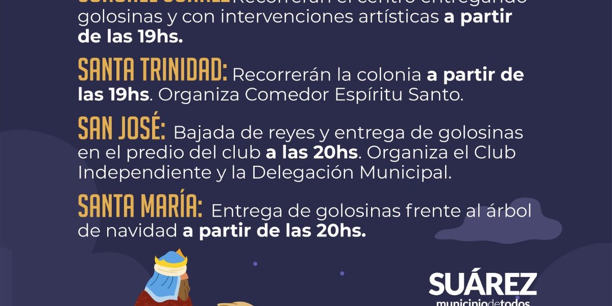 Melchor, Gaspar y Baltasar recorrerán los Pueblos Alemanes y la ciudad de Coronel Suárez el próximo lunes 5, en la previa de la celebración de Reyes Magos, con intervenciones callejeras, caravanas y entrega de golosinas para los más chicos. Cronograma de actividades: Pueblo Santa Trinidad – 19:00 hs Organizado por el Comedor Espíritu Santo. Los Reyes Magos recorrerán las