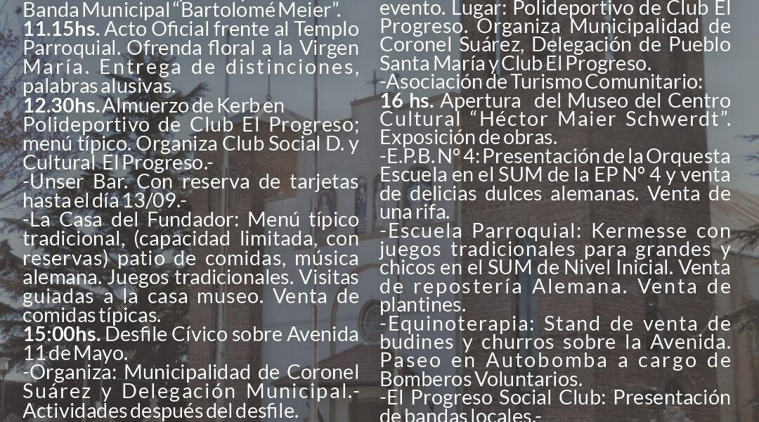 La actividad central será el próximo domingo 15 de septiembre a partir de las 10:30 con la celebración de la Santa Misa, luego el acto protocolar frente al templo y almuerzos de kerb organizados por las distintas instituciones de la comunidad. A las 15, el tradicional desfile cívico sobre Av. 11 de Mayo para finalizar la festividad con diversas actividades