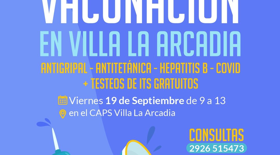 Viernes 19 de septiembre Lugar: CAPS Villa La Arcadia Horario: de 9 a 13 hs Se aplicarán vacunas antitetánica, hepatitis B, COVID y antigripal. Además, se realizarán testeos de ITS de manera gratuita. Por consultas comunicarse al: 2926-515473 Una propuesta para cuidar tu salud y la de toda la comunidad