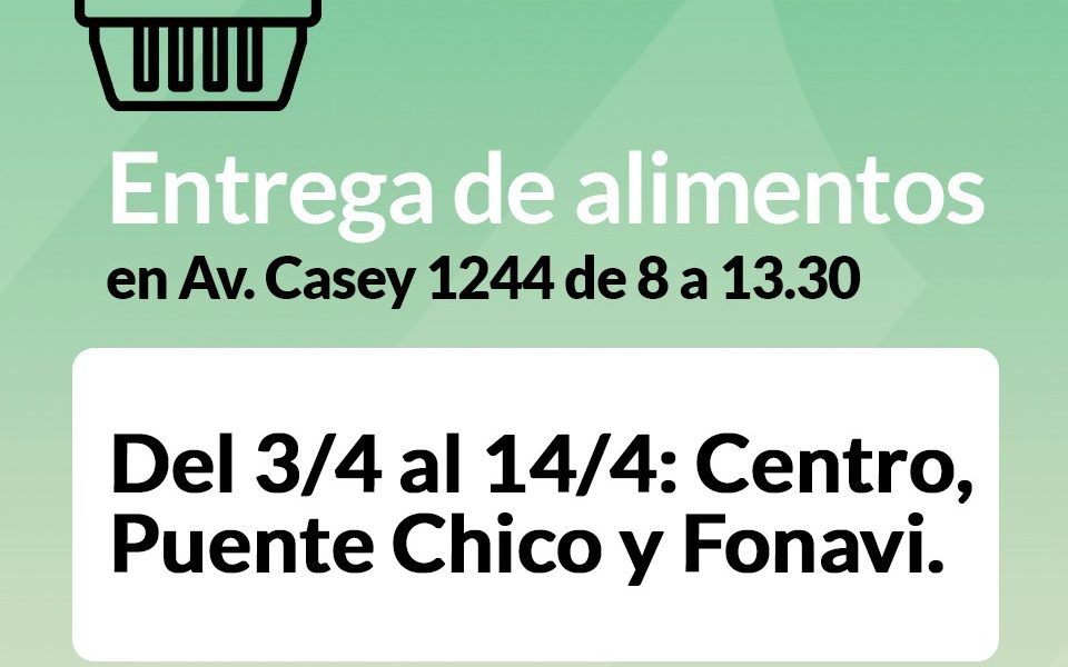 La subsecretaría de Desarrollo Social informa a las familias asistidas que continúa la entrega de alimentos secos correspondiente al mes de ABRIL, en Avenida Casey 1244, de 8 a 13:30. Las familias beneficiarias deberán respetar el cronograma de entrega SIN EXCEPCIONES. Del 3/4 al 14/4: Centro, Puente Chico y Fonavi. Del 17/4 al 21/4: San Cayetano, Villa Belgrano, Conturbi Norte