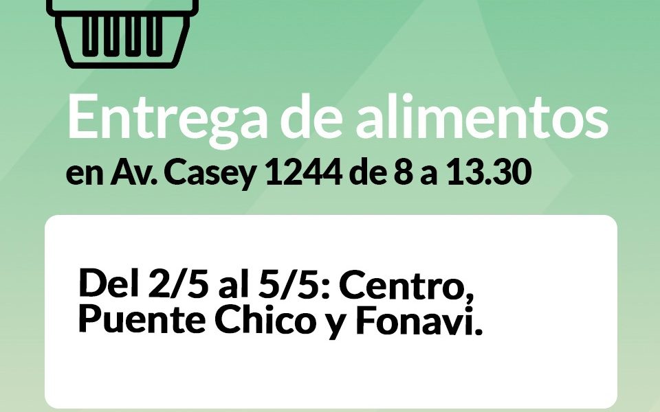 La subsecretaría de Desarrollo Social informa a las familias asistidas que continúa la entrega de alimentos secos correspondiente al mes de MAYO, en Avenida Casey 1244, de 8 a 13:30. Las familias beneficiarias deberán respetar el cronograma de entrega SIN EXCEPCIONES. Del 8/5 al 12/5: San Cayetano, Villa Belgrano, Conturbi Norte y Villa Etchegaray. Del 15/5 al 19/5: San Martín,