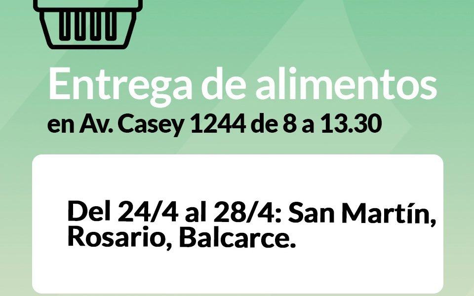 La subsecretaría de Desarrollo Social informa a las familias asistidas que continúa la entrega de alimentos secos correspondiente al mes de ABRIL, en Avenida Casey 1244, de 8 a 13:30. Las familias beneficiarias deberán respetar el cronograma de entrega SIN EXCEPCIONES. Del 24/4 al 28/4: San Martín, Rosario, Balcarce.